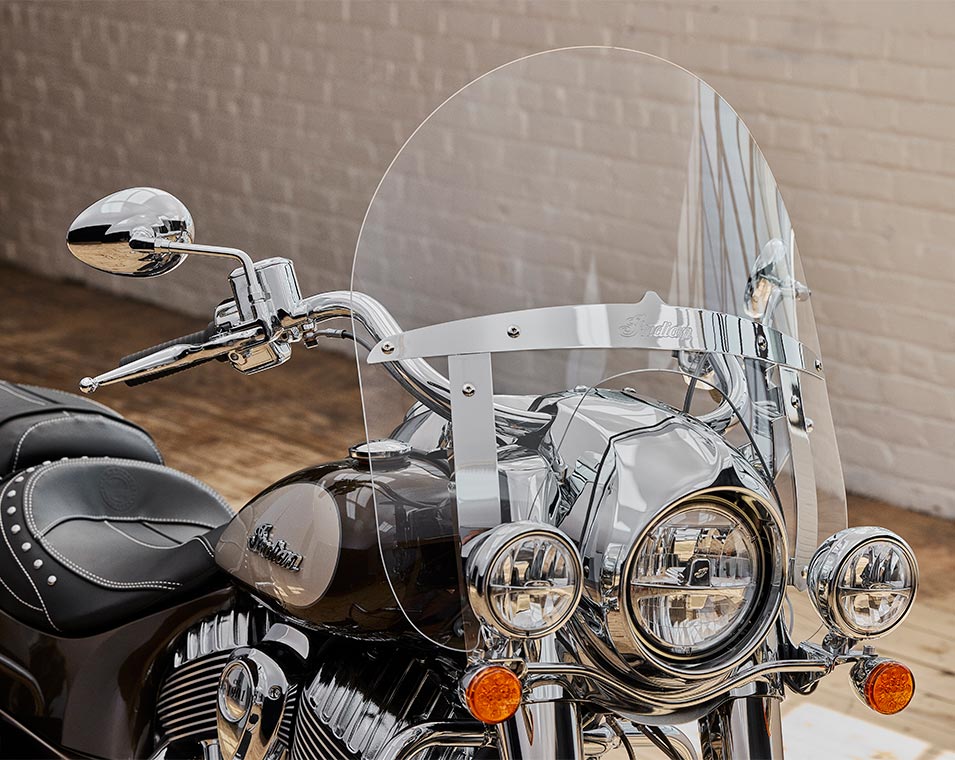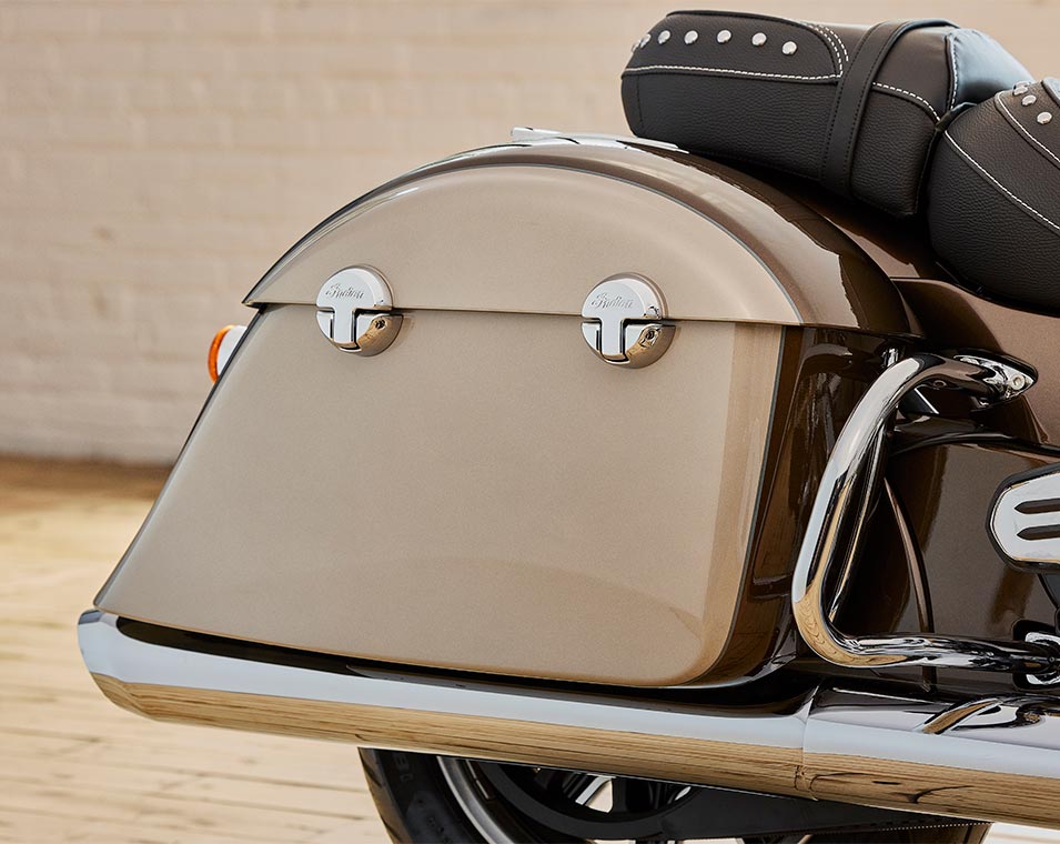 | Standard Equipment | Quick Release Windshield; Genuine Leather Seat; Remote-Locking Hard Saddlebags, Highway Bars; Tyre Pressure Monitoring; Light Bar; Selectable Ride Modes, ABS; Cruise Control; Keyless Ignition; Indian® Script Tank Badge; 12v Charging Port |